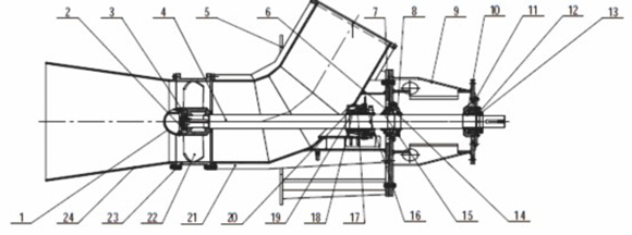 1-導流罩 2-葉輪鎖(suo)緊蓋 3-葉輪卡環 4-軸(zhou) 5-泵支架 6-下軸承壓(ya)🔞蓋 7-下💋軸承下擋套(tào) 8-下軸承盤 9-軸承支(zhī)架 10-軸承墊日 11-上軸(zhou)承盒 12-軸承墊🤞圈 13-上(shang)軸承壓蓋 14-下軸承(cheng)上擋目 15-下軸承壓(yā)蓋 16-填料壓蓋組件(jiàn) 17-水封環 18-填料箱 19-填(tian)料 20-軸套 21-泵體 22-葉輪(lún) 23-短節 24-吸入錐管